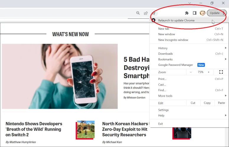 当有新版本可用时,Chrome会自动升级;当您关闭并重新打开浏览器时,更新通常会在后台运行。如果你有一段时间没有关闭Chrome,你可能会注意到右上角有一个挂起的更新: