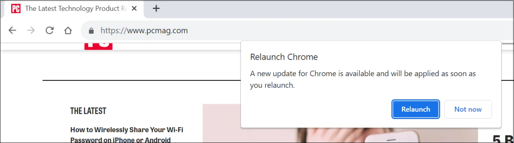 要快速更新,请单击三点更多菜单旁边的更新按钮,这将在您允许浏览器重新启动后重新启动浏览器。(如果您不希望立即重新启动,请在出现提示时单击NOT NOT;下次打开Chrome时将应用更新。)