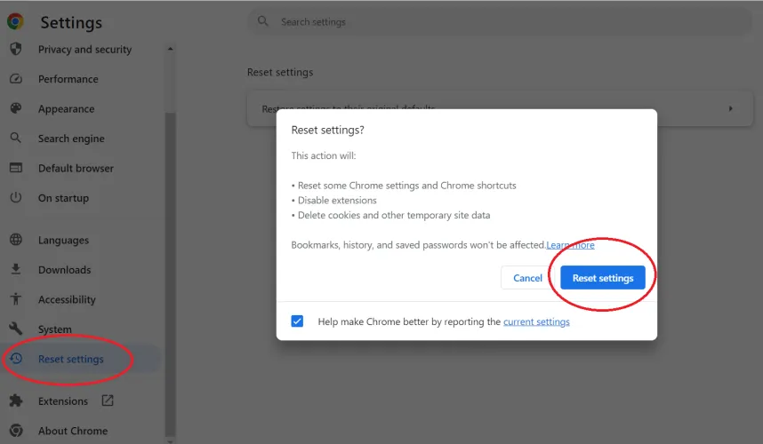 如果你仍然无法让Chrome配合,可能是时候将浏览器重置为其原始默认设置了。这意味着没有扩展、定制搜索引擎或其他保存的设置。打开设置>重置设置>将设置恢复为其原始默认设置>重置设置。