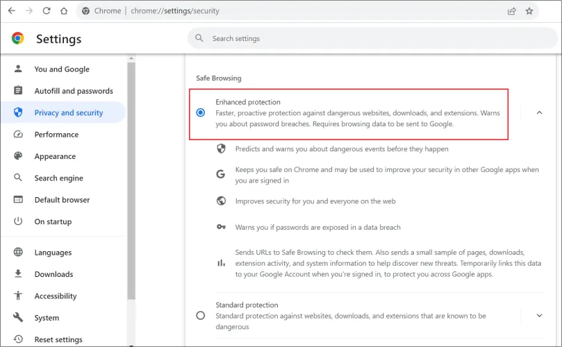 虽然该程序在今年早些时候被关闭,但谷歌表示,由于其在Chrome中的安全浏览和增强的保护功能,用户仍将受到“自动保护”。在设置下,导航到隐私和安全>安全,在那里你可以从标准保护切换到增强保护,它提供了“针对危险网站、下载和扩展的更快、更主动的保护,[并]就密码泄露向您发出警告。”