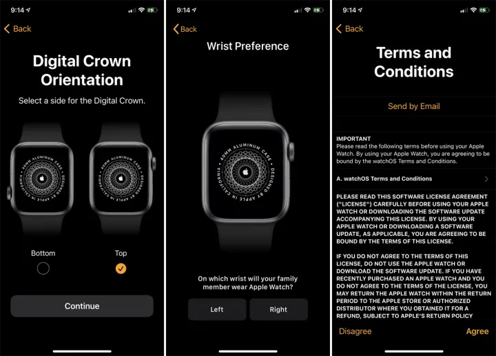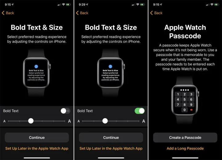 选择数字表冠的方向,并确定手表将位于左腕还是右腕。点击继续并同意条款和条件。移动滑块以选择文本大小,并决定是否要启用粗体文本。点击继续,点击创建密码,然后在手表上输入密码。