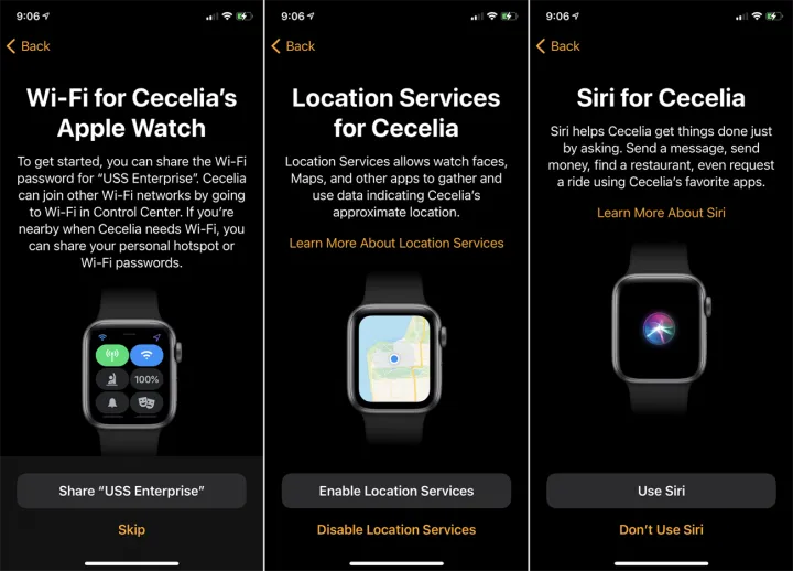 接下来,点击共享按钮,将您本地网络的Wi-Fi密码与手表共享。然后,你可以启用或禁用定位服务,并选择使用Siri。您还可以选择与Apple共享分析,并在iCloud中启用或禁用消息。