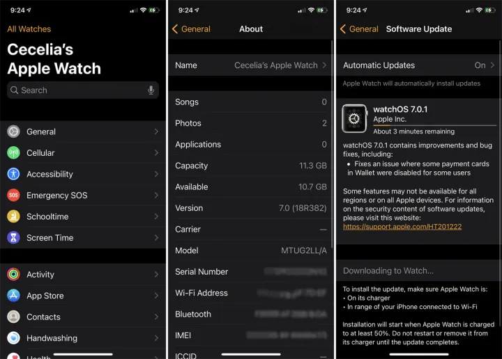 现在,您将看到用于管理家人手表的全屏幕。从这里,你可以调整活动、应用商店、联系人、洗手、健康、消息、锻炼和其他应用程序和功能的选项。转到常规>即将更改名称;点击软件更新以更新手表。