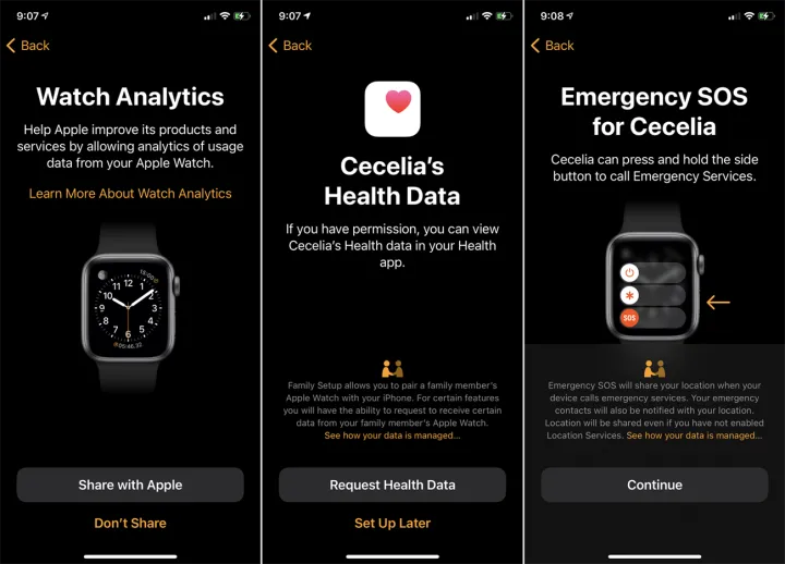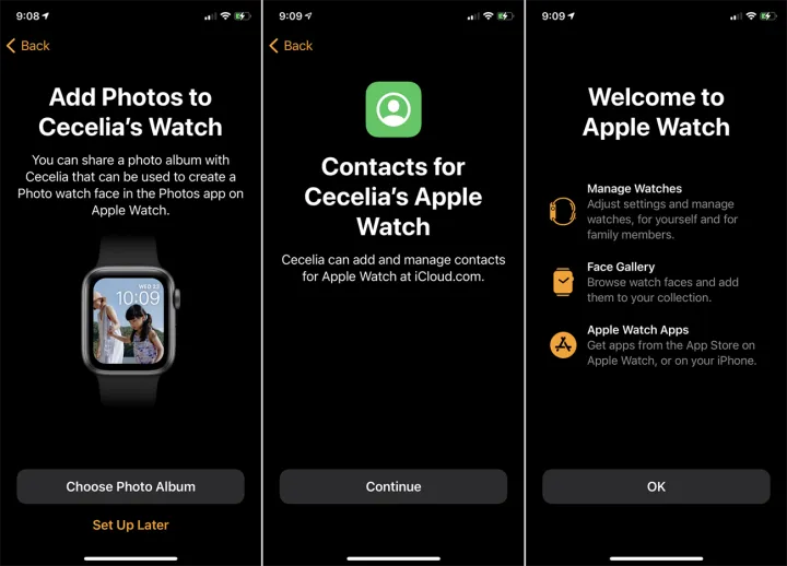 在下一个屏幕上,点击请求健康数据按钮,让家庭成员在手表上查看他们的健康信息。在紧急SOS屏幕上点击继续。点击选择相册以设置用作表面的相册。点击继续,允许用户通过iCloud添加和管理联系人。