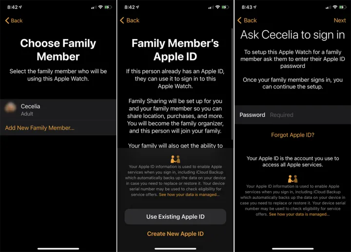 然后,您必须选择要为其设置此手表的家庭成员。在这里,您还可以选择添加新的族成员。在下一个屏幕上,要求家庭成员使用他们的Apple ID密码登录,然后点击下一步。