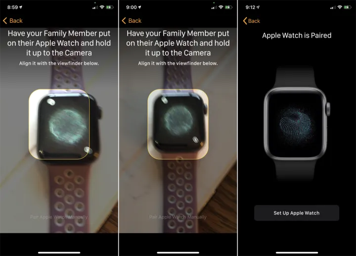 在Apple Watch上,选择语言和地区,然后点击开始配对按钮(如果需要)。将手机移到手表上方,直到通过相机捕捉到旋转的圆圈。然后你应该会收到一条消息,告诉你Apple Watch已经配对。点击设置Apple Watch按钮。