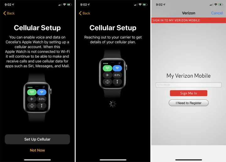 手机设置的屏幕解释说,如果手表没有连接到Wi-Fi网络,用户仍然可以拨打和接听电话,并使用手机数据来使用Siri、Messages和Mail等应用程序。点击设置手机,然后登录到运营商的手机账户。否则,您可以点击Not Now暂时跳过此过程。