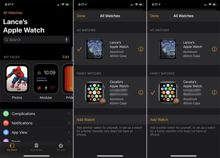 设置完成后,您可以通过iPhone上的Watch应用程序对手表进行定制、控制和管理。要做到这一点,打开Watch应用程序。所有监视屏幕可能会自动弹出。如果没有,点击所有手表。你应该同时看到自己的手表和家人的手表。点击适用于您家庭成员的按钮,然后点击完成。