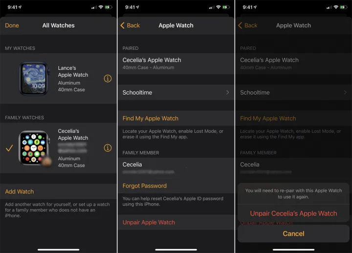 点击取消配对Apple Watch,然后输入此人的Apple ID密码。等待手表取消配对,然后其他人就可以用他们自己的iPhone设置手表。