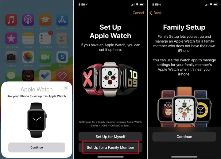 打开你想要设置的手表的电源,把它放在你的iPhone附近。等到您看到在您的iPhone上使用您的iPhone设置此Apple Watch的通知,然后点击继续。如果没有显示此消息,请打开手机上的Watch应用程序,点击顶部的All Watch链接,然后点击Add Watch链接。按Set Up for a Family Members(为家庭成员设置)。在下一个屏幕上,点击继续。