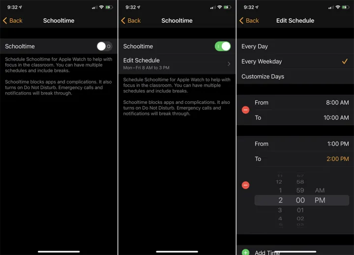 在这里,您可以启用每天、每个工作日或定制的学校时间计划。然后选择每天打开和关闭该功能的时间。