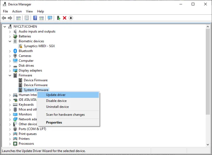 从任务栏中搜索“设备管理器”,然后打开控制面板应用程序并打开固件条目。右键单击系统固件,然后选择更新驱动程序。您可以让计算机在Web上搜索更新或找到您可能已经下载的文件。
