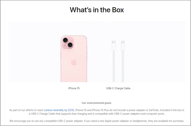 如今,新的iPhone盒中只有一根旧机型的Lightning-to-USB-C数据线或iPhone 15机型的USB-C充电线,这意味着消费者要么使用旧的适配器,要么从苹果公司购买新的充电器。该公司辩称,许多人已经拥有电源适配器,不需要另一个造成混乱,但移除电源适配器,仍然收取相同的手机价格,可能会让一些人更多地认为这是一种赚钱而不是可持续发展的举措。