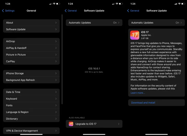 导航至设置>常规>软件更新。你可能必须点击屏幕底部的升级到iOS 17,然后点击下载并安装,否则你将被指示自动下载并安装。无论哪种方式,如果你的iPhone有密码,系统都会提示你输入密码。同意苹果的条款,然后等待。