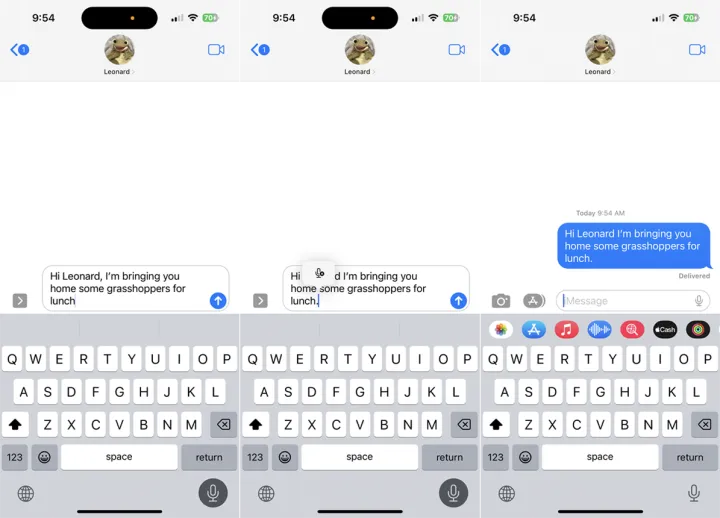 与其费力地用手指敲出你的课文,为什么不听写呢?轻触麦克风图标,可以是iMessage字段旁边的图标,也可以是键盘下方的图标。然后,只要说出你想打字的内容。