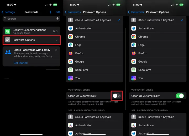 进入设置>密码>密码选项。在验证码下,打开自动清理旁边的开关。下次您确认向您发送的代码时,该消息将自动删除。