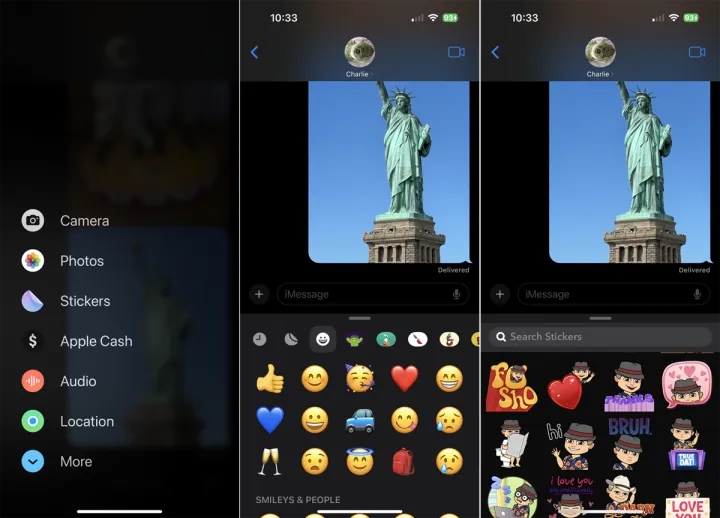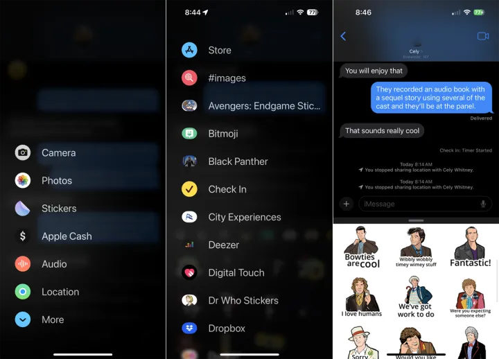 您只需在对话中点击iMessage字段左侧的+图标即可。弹出一个菜单,其中包含相机、照片、贴纸、Apple Cash、音频、位置等类别。点击您想要的类别。要查看其他类别,请向下滑动屏幕或点击更多,然后选择要访问的类别。