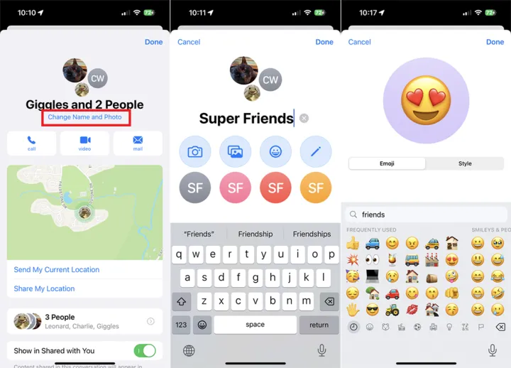 您可以为每个群组对话设置名称和图像。打开群对话,点击顶部的图标,然后选择更改名称和照片。然后键入群名称。然后,您可以通过几种不同的方式为组添加图像。
