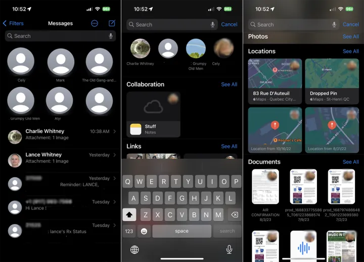 使用iOS/iPadOS 17,您可以根据消息的内容找到特定类型的消息。只需在消息中点击屏幕顶部的搜索字段即可。向下滚动,您将看到消息的缩略图,其中包含链接、照片、位置、文档等。轻触您要查看的项目,对话将打开。