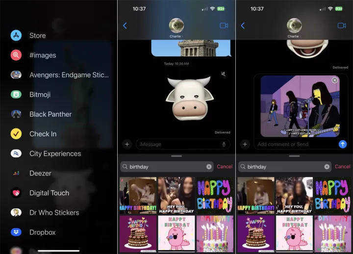 美化文本的一个有趣的方法是通过一个动画GIF。从应用程序菜单中,向下滑动屏幕并选择#图像。浏览搜索结果或按名称或主题搜索特定的搜索结果。选择您喜欢的动画图像,然后发送文本。