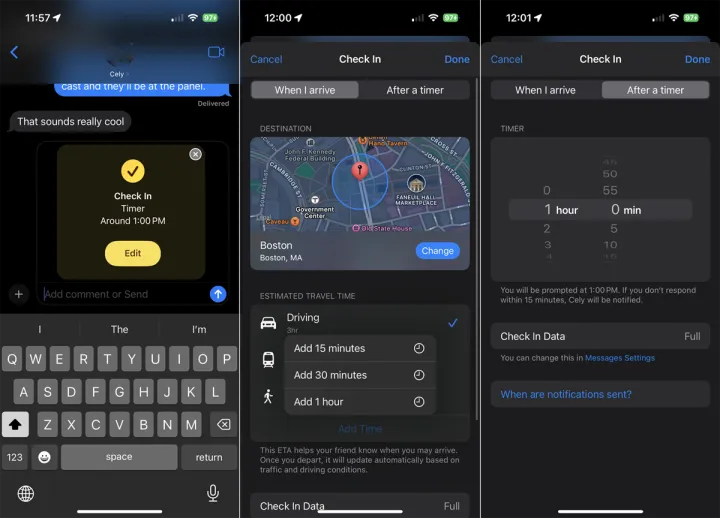 完成后,点击完成。回到消息屏幕,轻触箭头以发送消息。然后,当您到达目的地或计时器倒计时完成时,此人会收到警报。