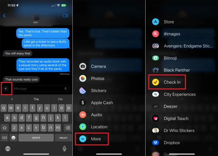 接下来,与您希望接收警报的人展开对话。点击iMessage字段左侧的+图标,选择More,然后点击Check In。第一次执行此操作时,请点击继续,然后再次继续。在下一个屏幕中,根据您希望包含在警报中的信息类型,选择受限或完全。