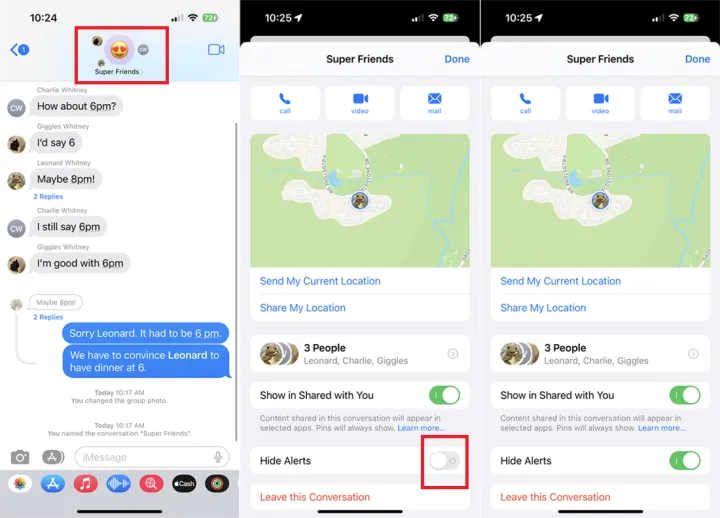 有时候,你不想每次收到某个人或某个组发来的新短信时都收到通知。没问题。要抑制这些警报,请打开对话并点击顶部个人或组的图标。打开隐藏警报的开关。