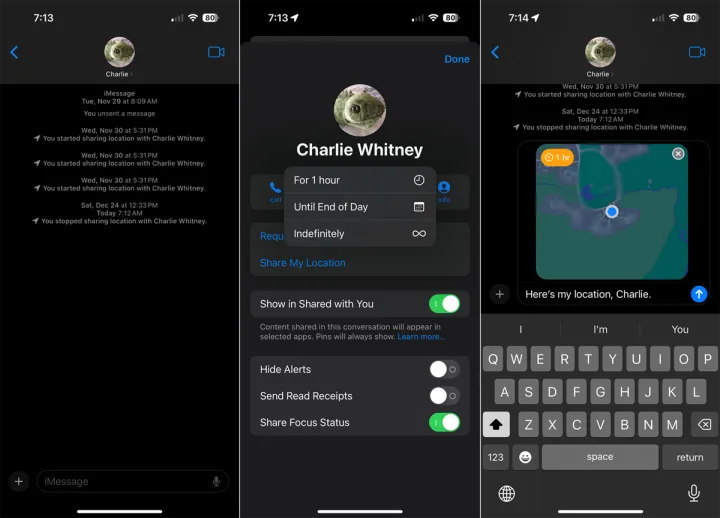 打开消息中的对话,然后在顶部点击该人的名字。选择共享我的位置,然后选择共享的持续时间-1小时,直到一天结束,或无限期。