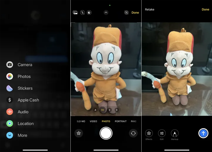 您可以轻松地将照片或视频附加到文本。点击iMessage字段左侧的+图标。要捕捉并添加新照片,请点击相机并拍摄您的照片。对于视频,请将相机设置为视频模式。然后,您可以添加某些效果。完成后,发送文本。