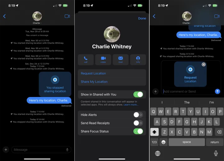您还可以请求查看其他人的位置。点击对话顶部的人名,然后选择请求地点。然后,该人员收到请求,可以批准或拒绝。