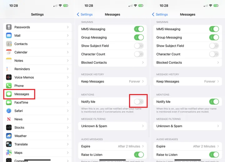 您可能想要隐藏群组对话的警报,但如果有人在对话中提到您,您仍希望得到通知。要进行设置,请转到设置>消息。在提及部分,打开Notify Me开关。现在,如果您静音的对话提到您的名字,您将收到通知。