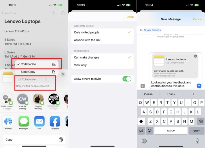 选择您希望就此便笺进行协作的对象,然后发送文本邀请其他人进行协作。然后,您邀请的收件人可以在其设备上的Notes应用程序中打开该便笺,并对其进行审阅或编辑。
