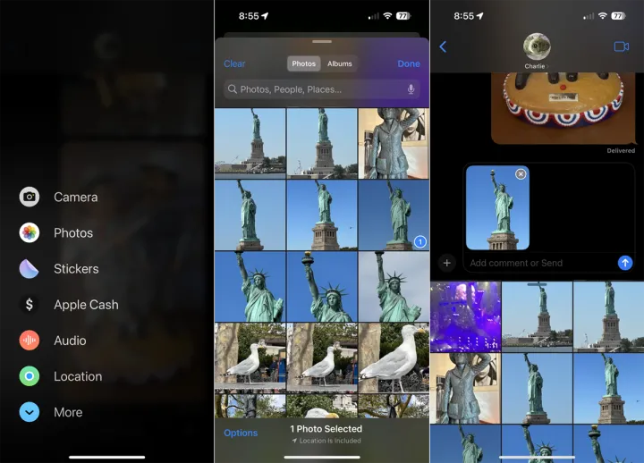 要添加照片库中的现有照片或视频,请点击+图标,然后选择照片。您的图片库显示在底部。在媒体库中滑动并选择要附加的照片或视频。您可以在发送之前预览视频。如果需要,可以添加文本,然后发送消息。