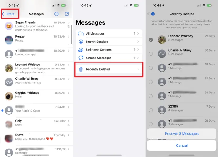 要从Messages应用程序恢复已删除的邮件,请点击左上角的Filters(过滤器),然后选择Recent Delete(最近删除)。轻触要带回的消息或对话,然后轻触恢复。确认您的操作。