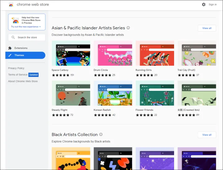 选择网上商店侧边栏上的主题选项卡以搜索各种类别。点击一个类别,然后选择你喜欢的主题,然后选择添加到Chrome下载主题并将其应用到您的Google页面。