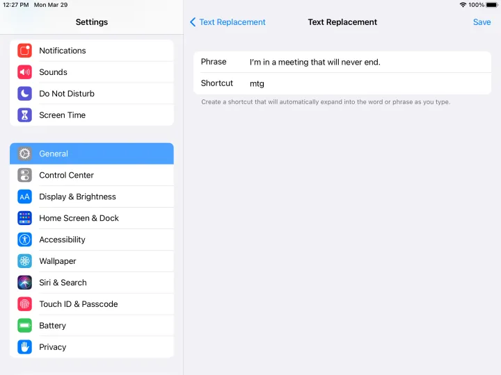 你有没有发现自己一遍又一遍地打字,比如“在回家的路上”或者“爱你胜过爱太阳和月亮!”?进入设置>常规>键盘>文字替换。单击顶部的加号(+)图标输入短语,然后输入快捷方式。然后,任何时候你输入快捷键(如“otw”),完整的短语(说,“我在回家的路上,别管我!”)弹跳在键盘的文本预览上的生活。你甚至可以用这个技巧输入一个字母组合,弹出一系列特定的表情符号。