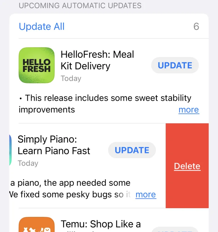 如果你不想等待,打开App Store应用程序,点击你的图片,向下滑动以更新,然后点击全部更新(如果出现)。(奖励:如果你在列表中看到一个你不再使用的应用程序,只需向左滑动即可将其删除。)