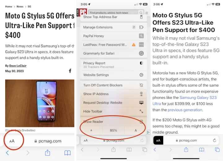 一些网站在默认设置下看起来很棒,而另一些则不是。你可以创建特定于一个网站的设置-例如,这样它就会显示比其他网站更大的字体。访问站点时,只需点击地址栏中的AA字体图标。你可以设置字体大小,也可以点击网站设置来指定你是否总是想要看到桌面版本;直接跳到Safari阅读器(它通过去掉多余的东西使页面更容易阅读);或者关闭你所有的内容和广告拦截程序。
