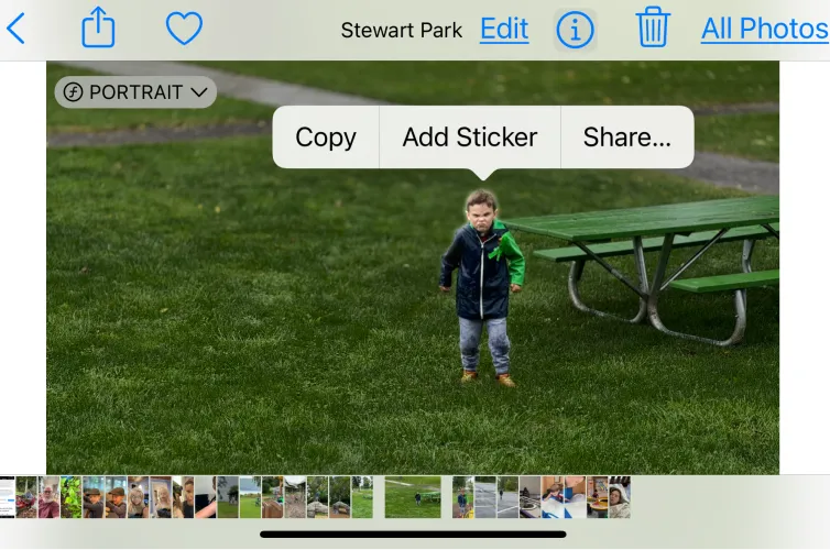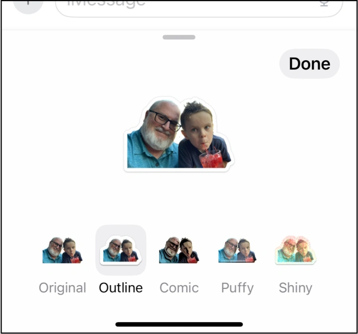 要做到这一点,从照片应用程序开始,将手指放在你想要粘贴的图像部分;或者在信息中的贴纸部分,单击加号图标进入照片。你从一张照片制作的每一张贴纸都有自己的特殊效果,比如看起来浮肿或变成漫画艺术。