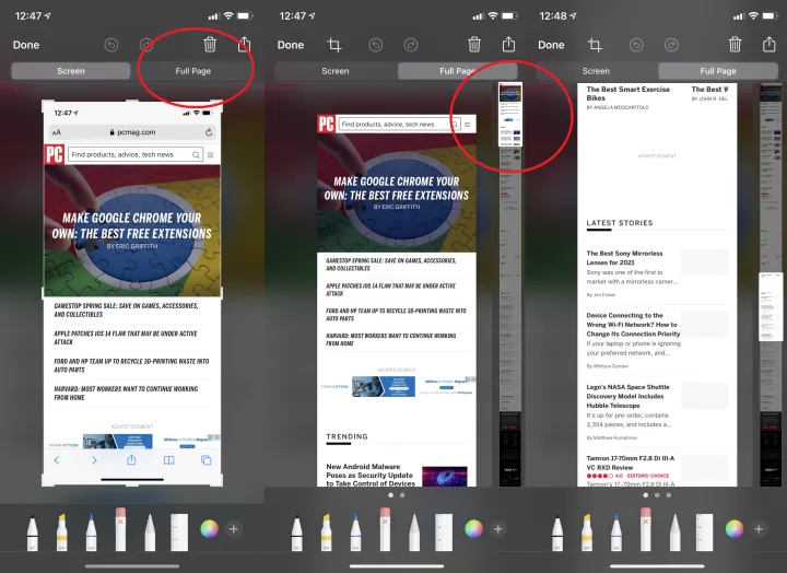 当你在iPhone上截屏时,左下角会出现一个用于注释的缩略图。轻触即可全屏观看。如果你是在使用Safari浏览器时拍摄的,而你所在的网页超出了屏幕的大小,那么扫一眼顶部的标签,上面写着“Full Page”。点击它,右边会出现一个滑块,显示整个页面,即使你最初没有滚动整个页面。您可以只裁剪到您想要的区域,或者单击完成将其另存为PDF、复制或删除。