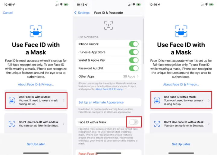 人脸识别的目的是在眼睛、鼻子和嘴巴都能被相机看到的情况下工作。但你可能还在蒙面。苹果推出了一个选项,即使你的嘴巴和鼻子被遮住了,仍然可以使用面部认证–扫描只会粘在你的眼睛上。它没有那么安全,但它可以(在iPhone 12和更高版本上)工作。