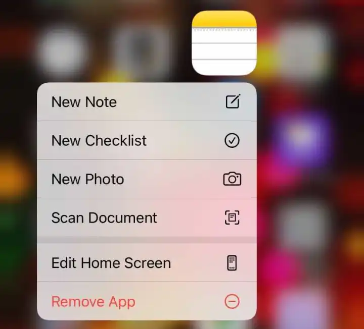 将手指按在Notes应用程序图标上,可以调出要做的事情的即时菜单:您可以添加新的便笺或新的核对表,以及扫描文档。后者是一个强大的工具,它为您提供了一种将物理文档中的所有页面拍摄照片并将它们缝合到一个PDF中的方法。然后,你可以在应用程序中逐页查看,并与其他人分享。