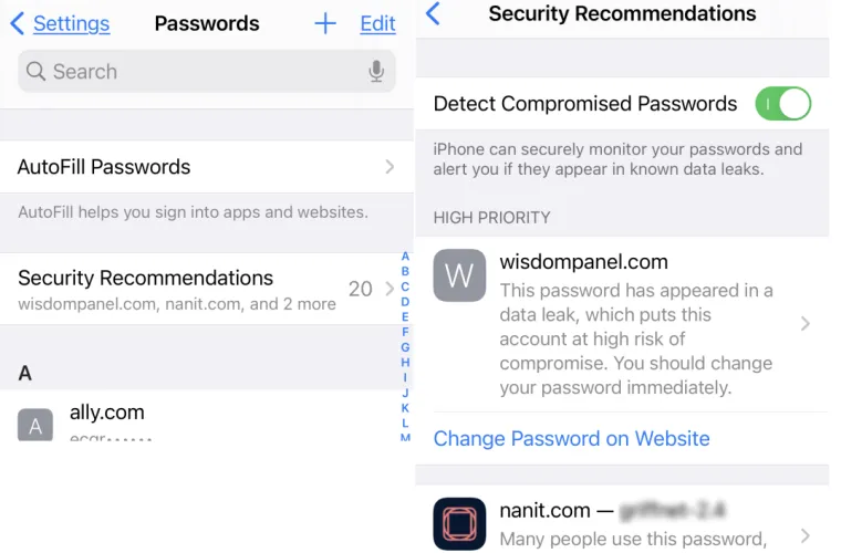 当你在iOS中存储大量密码时,无论是应用程序还是网站,安全建议都很方便。该功能会告诉你密码是否出现在已知的数据泄露中,如果你有重复的密码,它会建议你进行更改(因为这是一个大禁忌)。在设置>密码>安全建议中可以找到这一点。