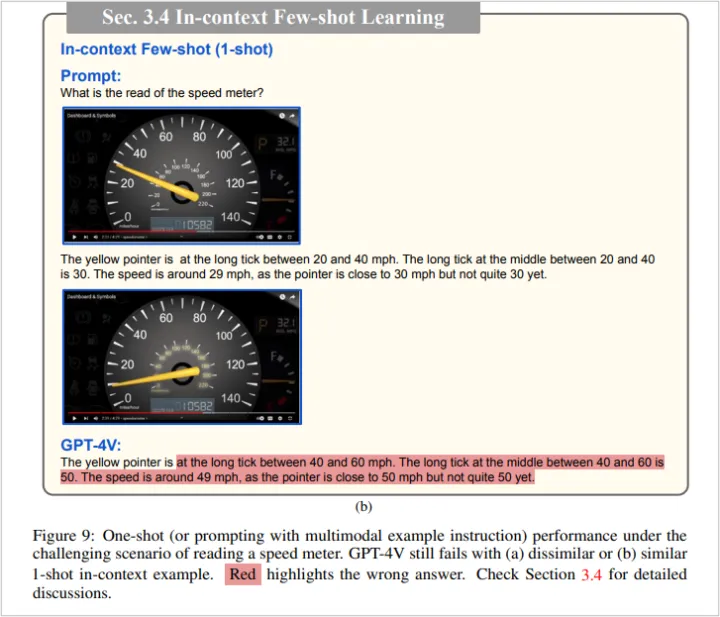 用户也可能会注意到不准确的地方。例如,微软的一个研究团队发现,GPT-4V对一些简单的图像提示回答不正确,比如读错了里程表。