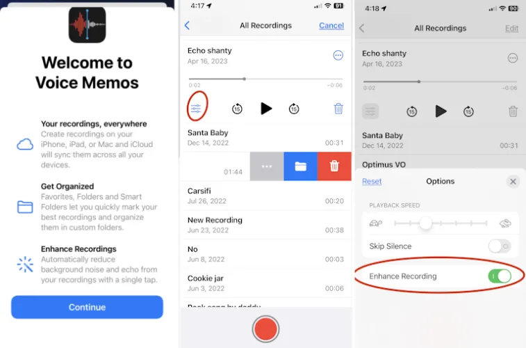 在语音备忘录中,您可以使用增强型录音来减少背景噪音。录制一段录音,单击均衡器菜单,然后在选项下,打开增强录音以使其听起来更好。您还可以使用此屏幕调整播放速度或跳过录制中的静音。