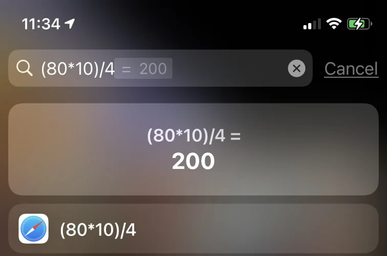 如果您有一些加法、减法、乘法或除法需要快速完成,只需使用搜索栏。在主页或小工具页面上,从屏幕中央向下滑动进行搜索,输入操作,您就会得到答案。它足够灵活,可以意识到“x”和“*”都可以用于乘法。它甚至可以处理9^2(9的平方,等于81)或9%100(9,等于100的9%)这样的运算。点击键盘上的Go,它会把你推到Calculator应用程序。
