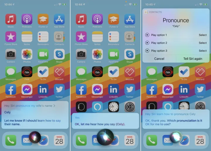 有时,Siri的名字会弄错,这很可悲。有时她会意识到这一点,并问她是否应该学习如何发音,但在其他时候,你必须纠正她。说“嘿,Siri,学习如何发音[名字]。”一旦她在你的联系人中确认了你想要的名字,她会让你发音,然后在屏幕上提供选择。选一个她做对的。
