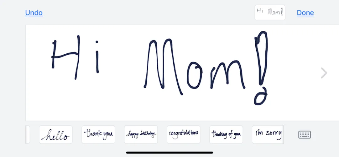 有时你想把一张手绘的画寄给朋友。你不需要在纸上画素描和拍照。在消息串中,只需将手机转向横向;键盘上会显示一个看起来像手绘环状的图标。单击它可以在空白画布上绘制(仅限黑色)。您发送的任何内容也将列在底部,供以后再次使用。按住预先写好的便笺上的手指即可将其删除。