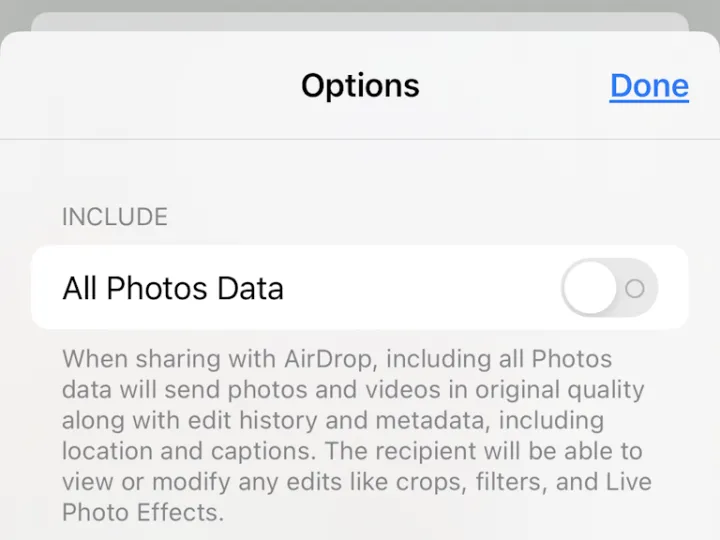 当你直接从Photos应用程序向某人或服务分享照片时,照片会带走拍摄时收集的所有信息,包括位置数据。你可能不想分享这一点。取而代之的是,查看照片并单击共享按钮,但在共享之前,请单击顶部的选项。关闭所有照片数据。这将删除所有内容,包括您可能已应用的编辑历史记录、裁剪、滤镜和实时照片效果。