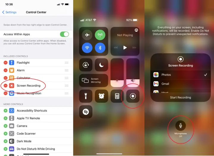 要在iPhone和iPad上进行屏幕录制,请导航到设置>控制中心,并确保屏幕录制列在包含的控件下(如果没有,请点击下面的绿色加号按钮)。屏幕记录按钮随后会出现在控制中心。录制时,您可能会注意到它还在录制音频,因此您可以录制画外音。如果您稍后要添加语音或不需要画外音,请长按控制中心的按钮。在下面,您将看到麦克风关闭或麦克风打开-设置您的首选项。